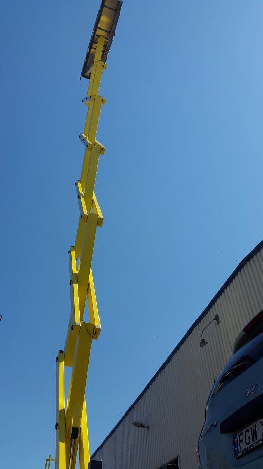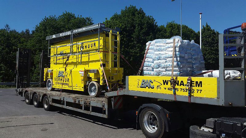 Nůžkový výtah na baterie H.A.B. S280-12E s rozměry plošiny: je na cestě na stavbu vysokého skladu v Kutně.