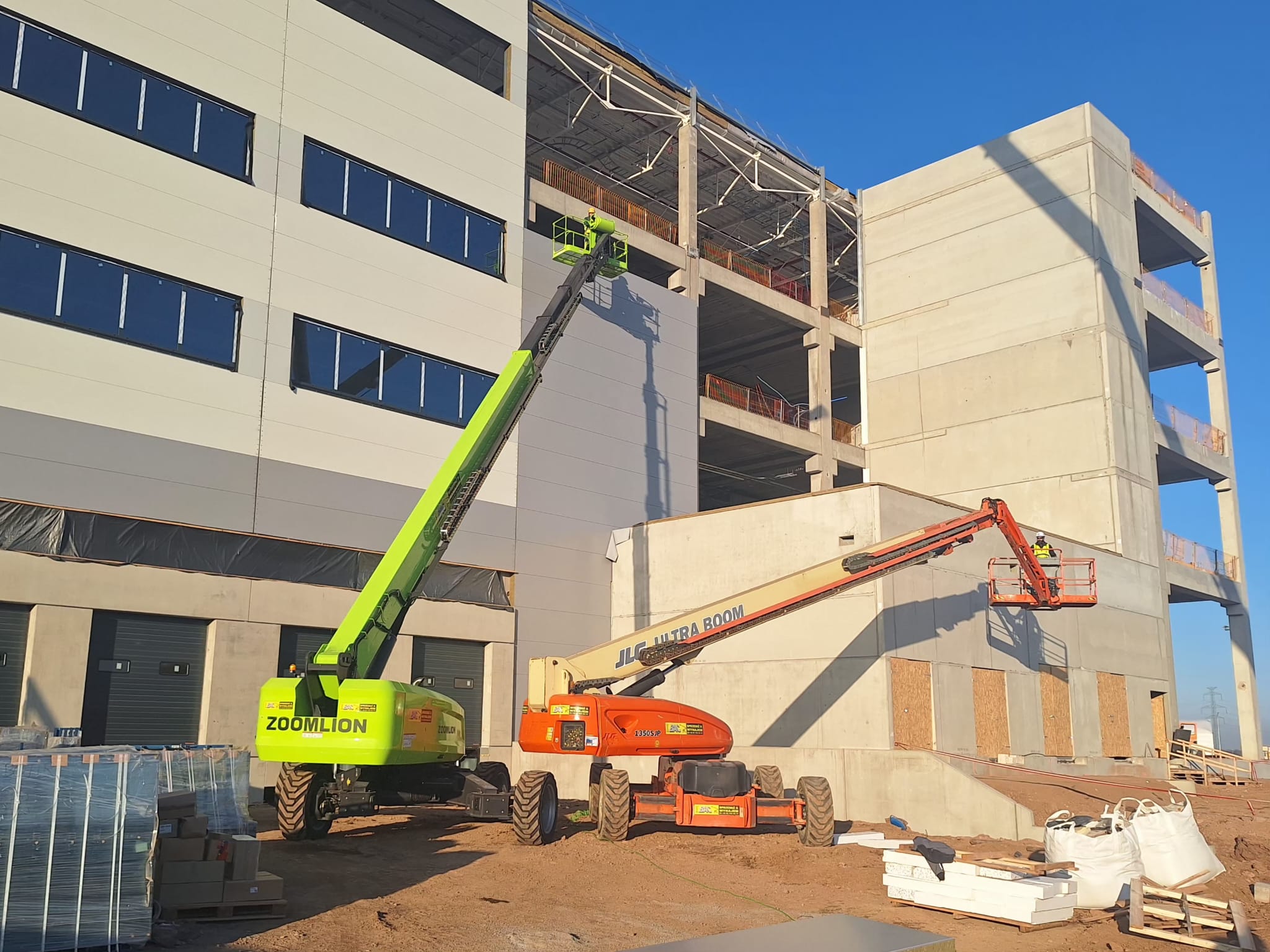Na zdjęciach nasze podnośniki teleskopowe Zoomlion ZT42J-V oraz JLG 1350SJP podczas budowy nowego obiektu przemysłowego.